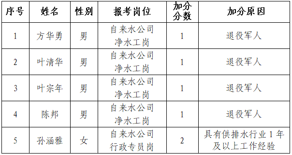 根据《开云app入口站官网招聘公告》规定,“对报名参加自来水公司净水工岗位的考生如满足退役军人身份给予综合成绩加1分,荣获个人三等功以上的退役军人给予综合成绩加2分,具有供排水行业1年及以上工作经验者给予综合成绩加2分。对报名参加自来水公司行政专员岗位的考生如具有供排水行业1年及以上工作经验者给予综合成绩加2分”。现对报考人员申请加分的审核工作已全部结束,经审核符合加分条件的人员共5人,现予以公示,接受社会监督。公示时间为2020年11月13日—11月15日。公示期间,如对加分情况有异议,请向黄山市开云中国集团反映。公示期满后,如无异议的,按规定程序办理加分手续,逾期不再补办。联系电话:0559-6525368,15665592628。