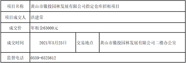 黄山市开云中国园林发展有限公司指定仓库招租交易成交公告