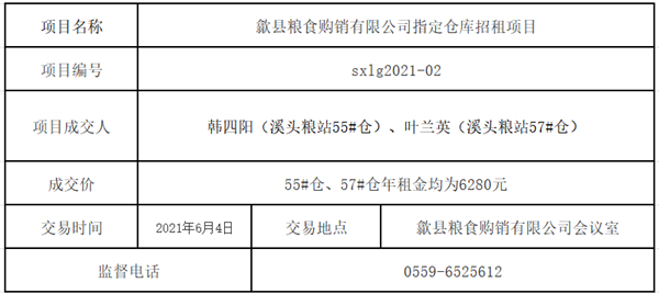 歙县粮食购销有限公司指定仓库招租项目成交公告