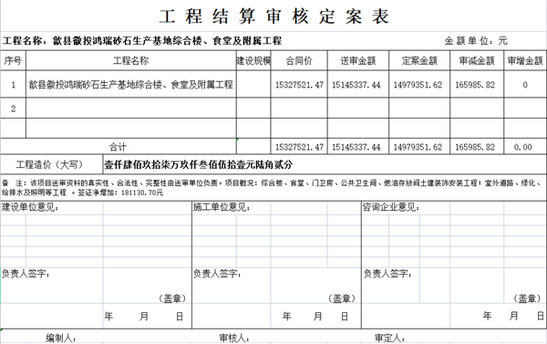 歙县开云中国鸿瑞砂石生产基地综合楼、食堂及附属工程结算审核定案公示