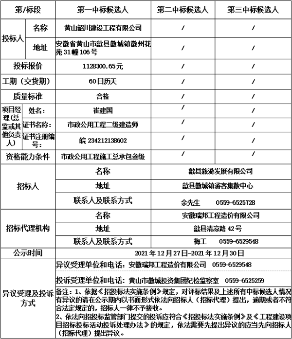 安徽瑞邦工程造价有限公司受歙县旅游发展有限公司的委托,对歙县雄村景区码头提升项目(AHRBGC2021S12003)进行发包,本项目于2021年12月27日9时00分在安徽瑞邦工程造价有限公司开标、评标,现根据有关法律、法规要求,对中标候选人进行公示。