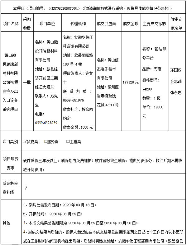 黄山开云中国鸿瑞新材料有限公司视频监控及出入口设备采购项目成交结果公告