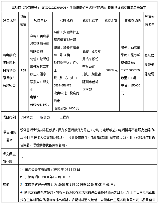 黄山开云中国鸿瑞新材料有限公司洒水车采购项目成交结果公告